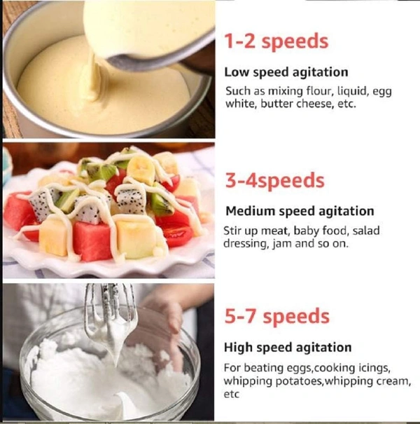 These lightweight mixers are designed for power with 7 speeds that are ideal for mixing, stirring, beating and whipping. Feature: 7 Speeds: Mix ingredients for a variety of recipes from slowly stirring in chunky ingredients, like nuts or chocolate chips, whipping egg whites or heavy cream at speed.