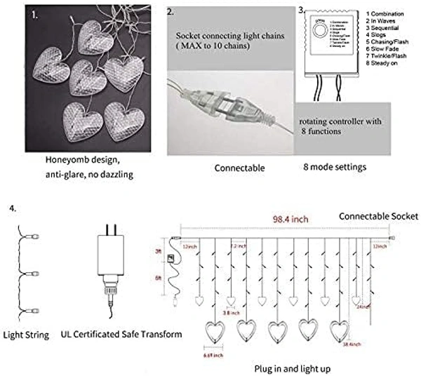 Heart Shape Curtain String Lights with 8 Flashing Modes Decoration (12 Hearts, Warm White), Prong Base, Pack of 1 Warm White