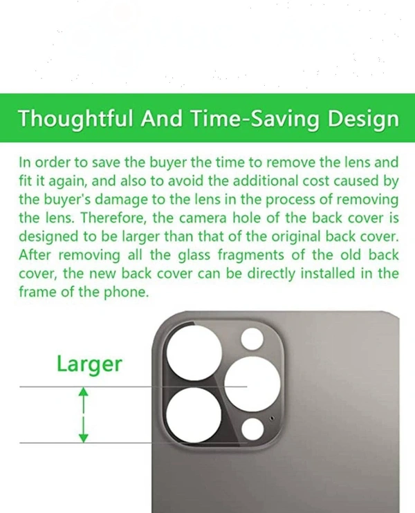 Bigger Camera Hole: There is no need to remove the camera lens as the new Back Glass comes with a bigger camera hole. To save time and avoid damaging the Rear Camera Module in the process of removing the lens and causing additional costs, the camera hole on the iPhone back glass replacement is designed to be slightly larger than the original one. After removing all the glass fragments from the old Back Glass, the new Back Glass can be directly installed in the frame of the iPhone.