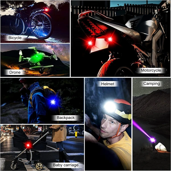 - Versatile - These lights can be attached to pet collars, backpacks, helmets, and jogging or walking gear. Use the included fasteners to securely strap the lights onto boating bows and sterns, drones, bicycles, arms, wrists, and ankles. Suitable for installation in cars, motorcycles, bicycles, Drones.
