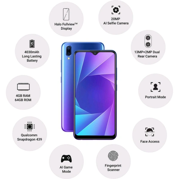 The Vivo Y95 features a 15.80-cm (6.22) Halo FullView HD+ Display along with a maximized screen-to-body ratio of 88.6%. Its large aspect ratio and the small-sized camera at the center provide you with a more expansive view.