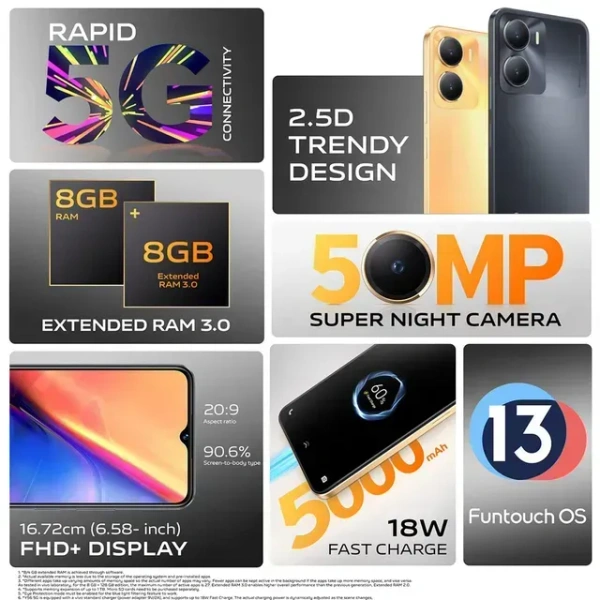 - Camera: Dual 50MP+2MP Rear Camera | 16MP Selfie Camera with rear flash, night mode